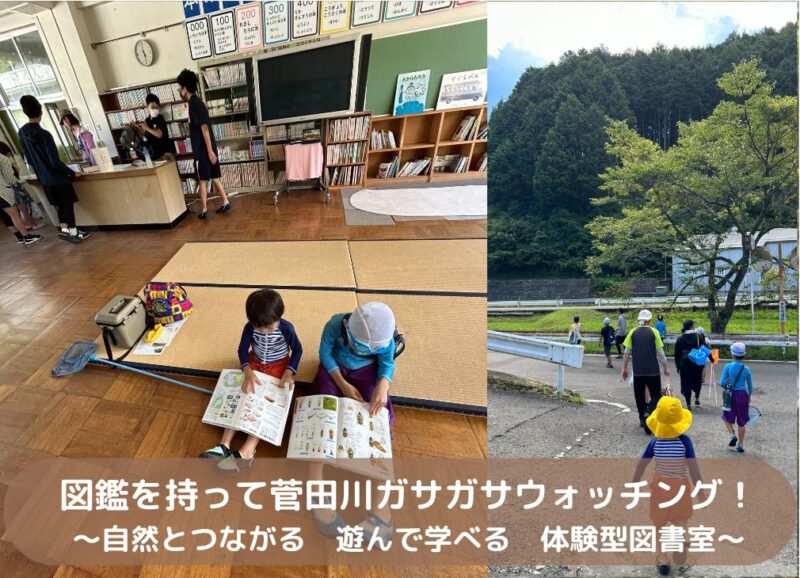 この校舎の図書室『いっぷく図書図鑑センター』に残されたたくさんの図鑑や本を活かし、私たちは「図鑑を持って川へ行く」という新しい体験を子どもたちと行っています。