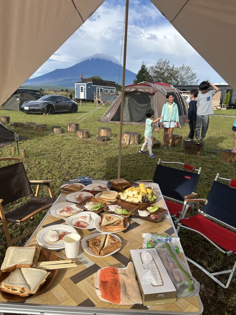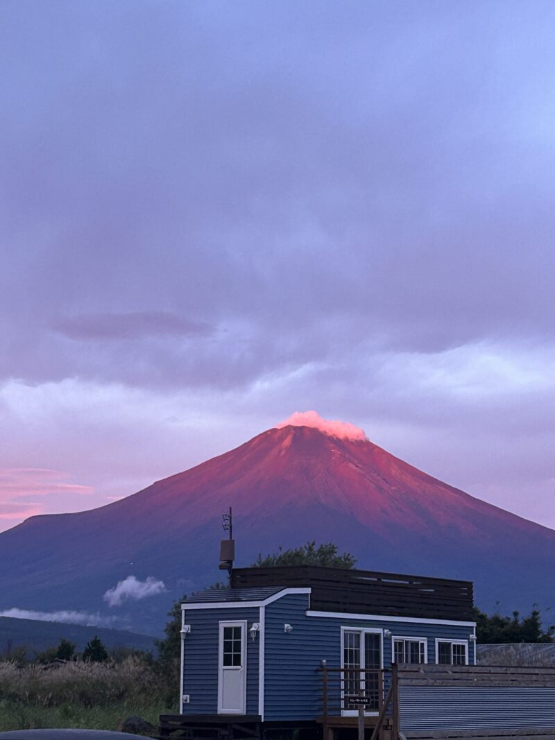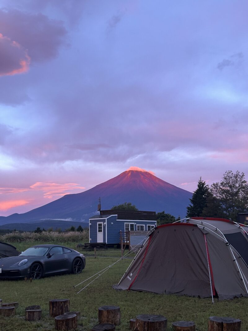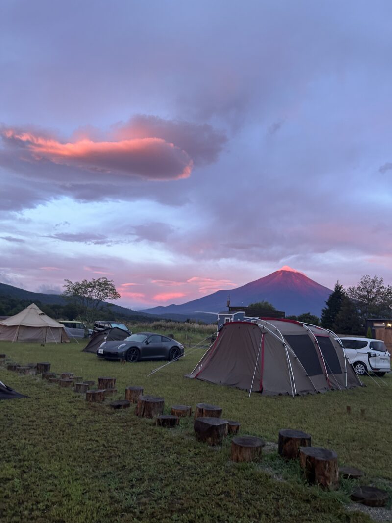 キャンプ2日目は、長男の誕生日でした。早朝、小鳥のさえずりで目が覚めてテントの外へ出てみると、前日の雨風が晴れて、富士山が姿を現していました。朝焼けに染まり真っ赤になった赤富士を見ることが出来て、まるで誕生日を祝福しているかのようで感動しました。