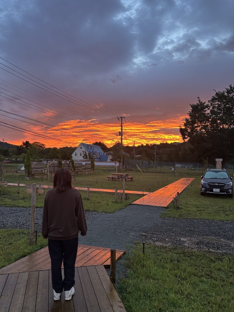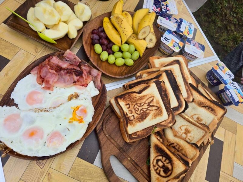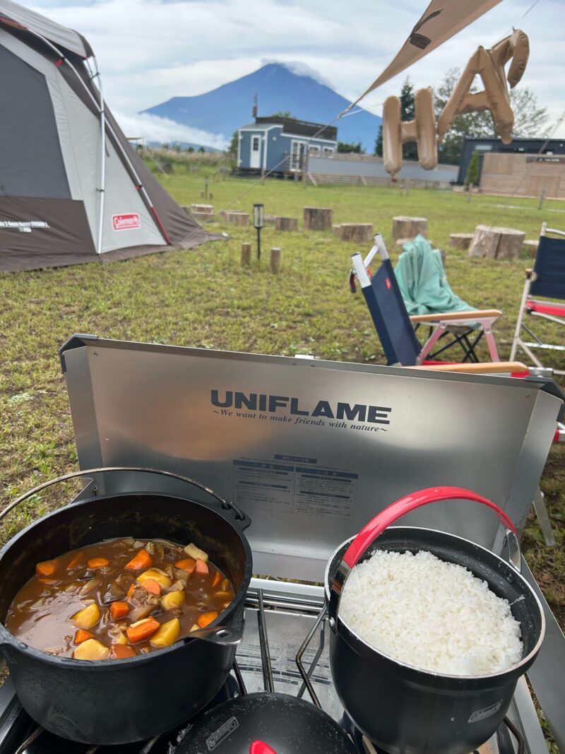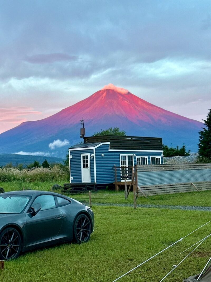 キャンプ2日目は、長男の誕生日でした。早朝、小鳥のさえずりで目が覚めてテントの外へ出てみると、前日の雨風が晴れて、富士山が姿を現していました。朝焼けに染まり真っ赤になった赤富士を見ることが出来て、まるで誕生日を祝福しているかのようで感動しました。