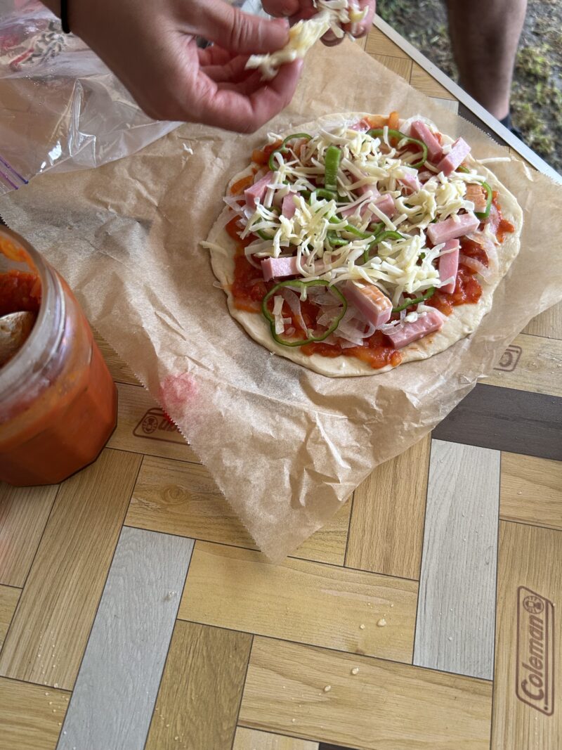 ベテランキャンパーの友達が、ピザ生地とトマトソースをあらかじめ家で手作りしてきてくれました。