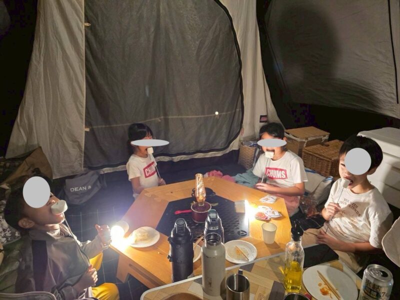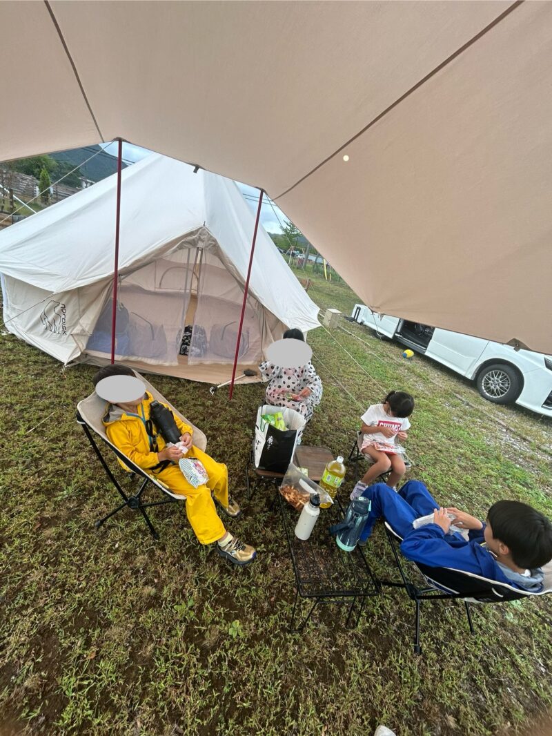 レインウェアで雨風を凌ぎながら、なんとか設営できましたが、初日は風で何度もタープが倒れてしまうのでテントのみにし、夕食や就寝までは、隣のお友達ファミリーのサイドシート付きタープにお邪魔して快適に過ごせました。