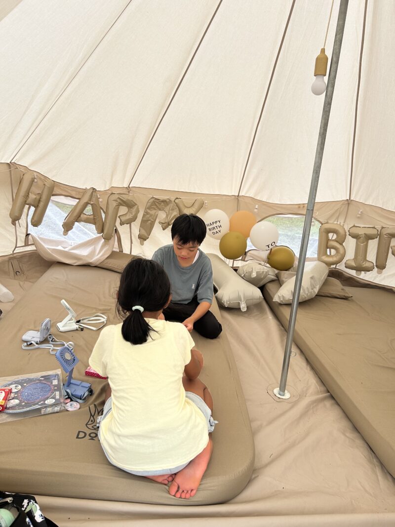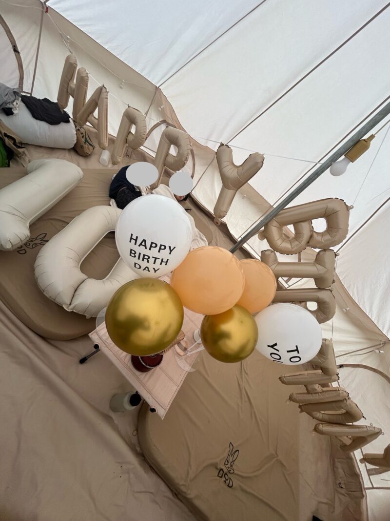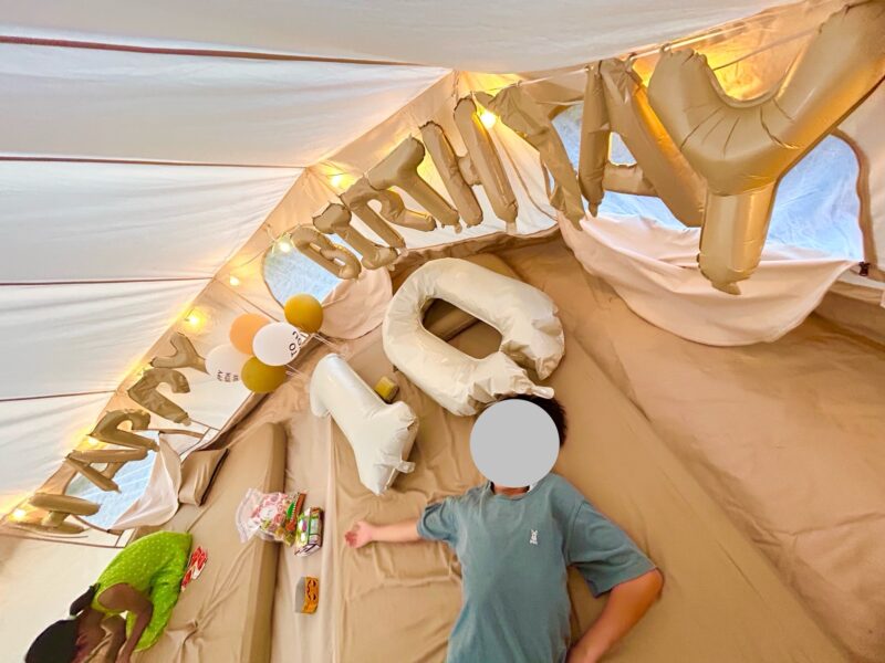 長男が寝ている間にテント内をバースデー仕様のバルーンで飾り付けしてサプライズ。